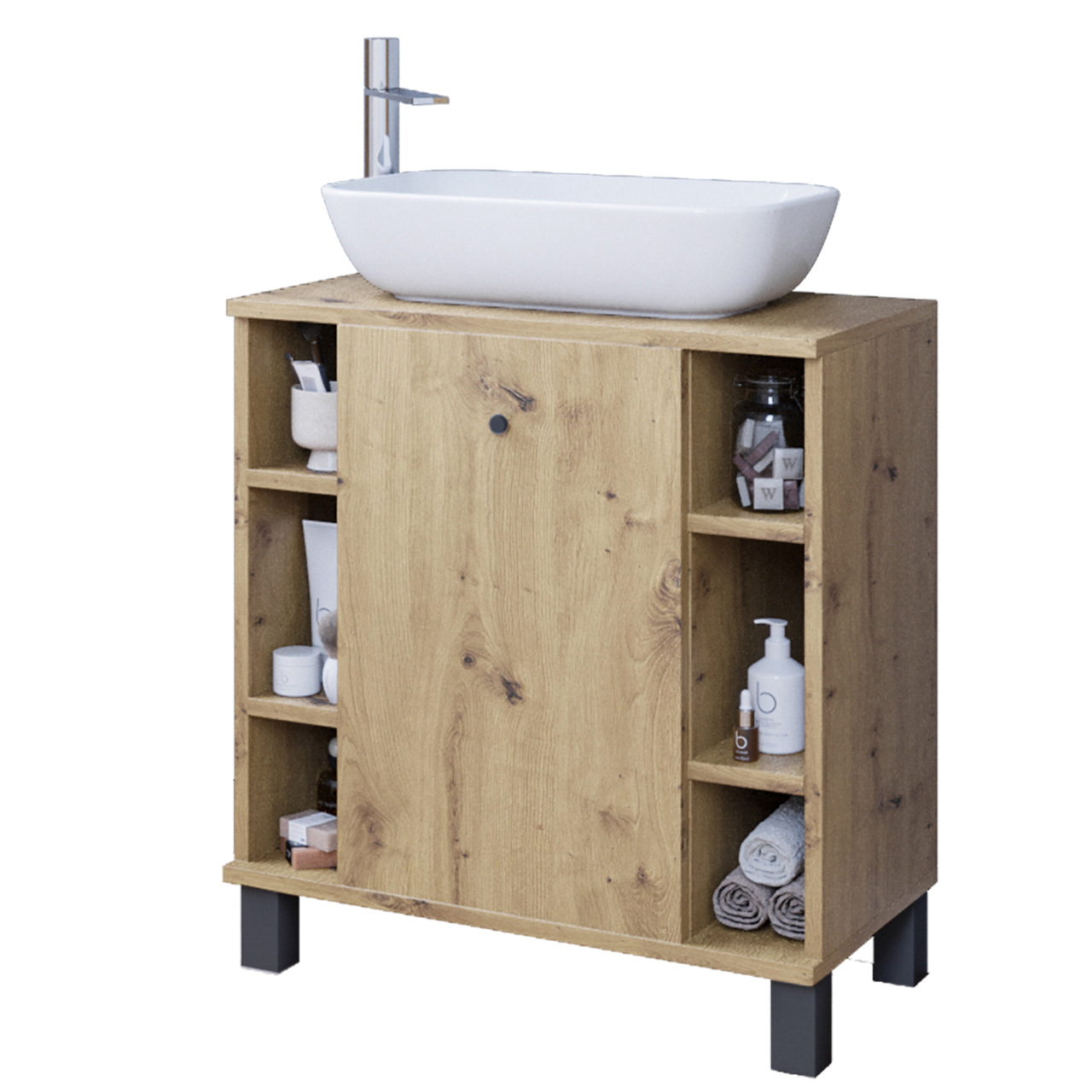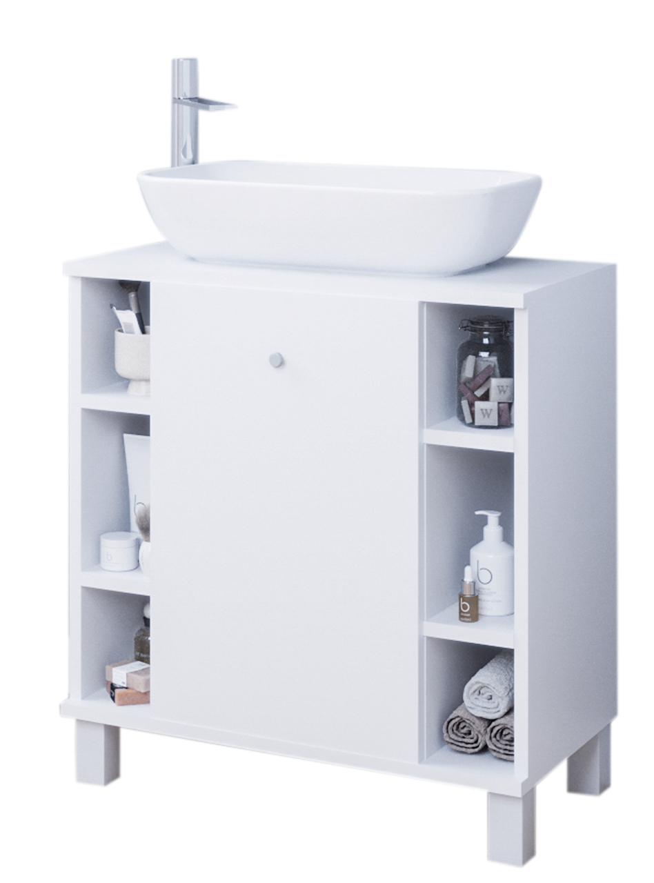 Szafka pod umywalkę wpasowująca się we wnętrze każdej łazienki. Wygodne i praktyczne półki pomieszczą wszystkie niezbędne rzeczy i kosmetyki potrzebne na co dzień. Plastikowe nóżki uniemożliwiają przypadkowe zalanie mebli. Ciekawa, a zarazem klasyczna kolorystyka wkomponuje się w styl Twojego mieszkania. Wykonana ze starannością z wysokiej jakości materiałów, co daje możliwość użytkowania przez długie lata.