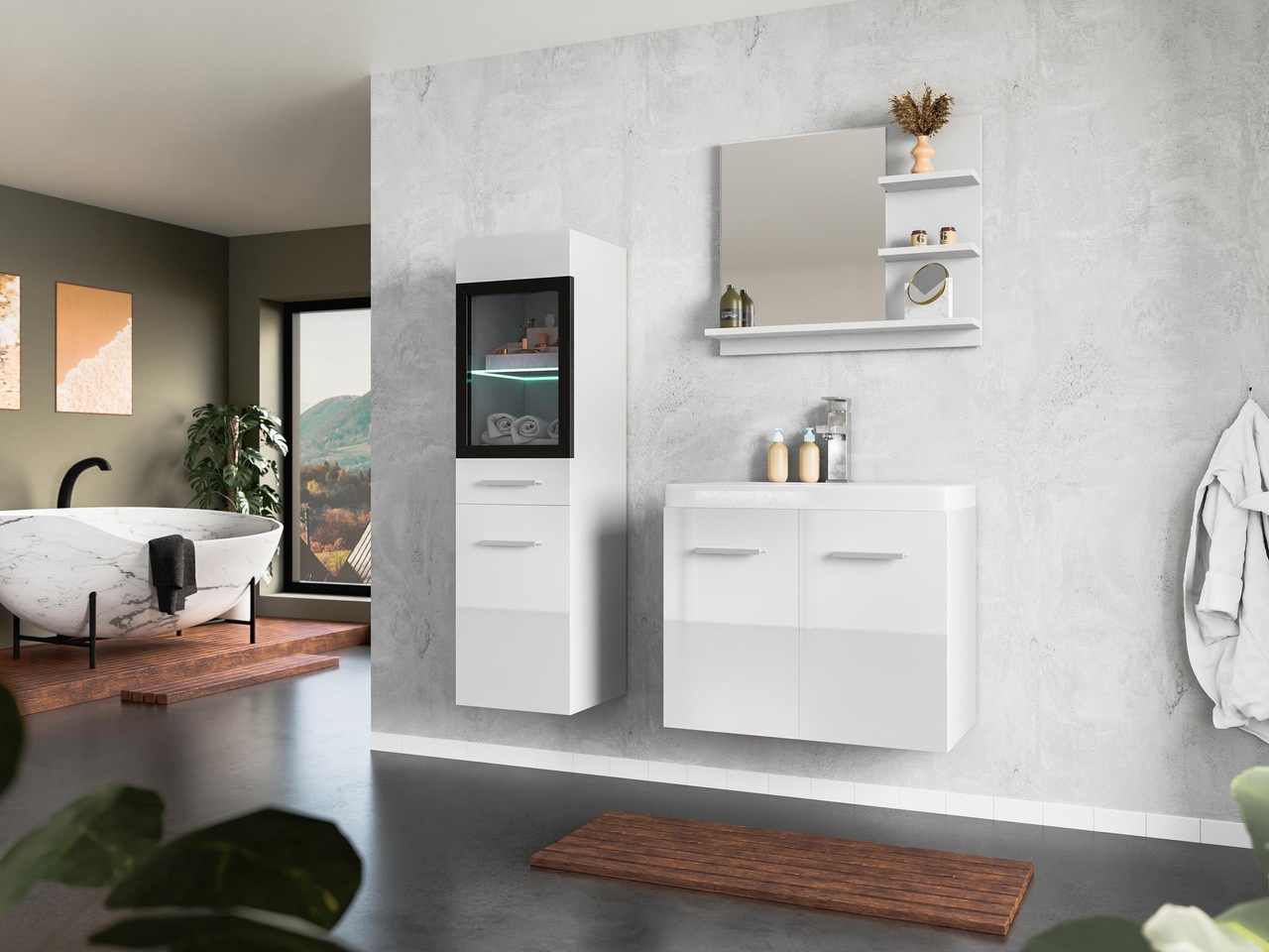 Oświetlenie LED to niezaprzeczalny plus tej szafki! Błyszczące wykończenie nadaje modnego wyglądu Twojej łazience. Szafkę możesz połączyć z innymi meblami łazienkowymi LAURINE, aby stworzyć nowoczesny zestaw.