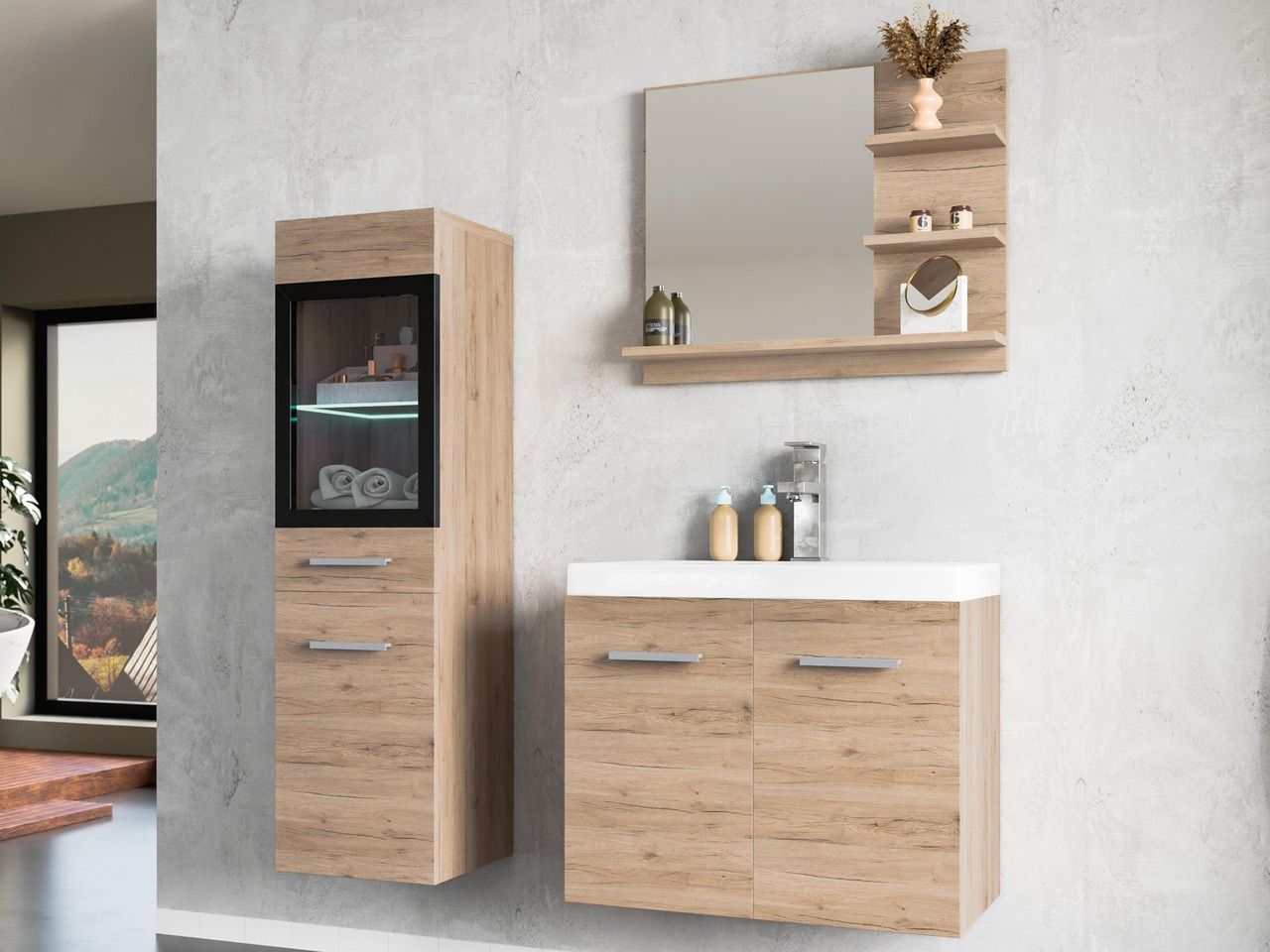 Materiał wykonania: płyta wiórowa, wykończenie laminowane z wewnętrznym oświetleniem LED.
