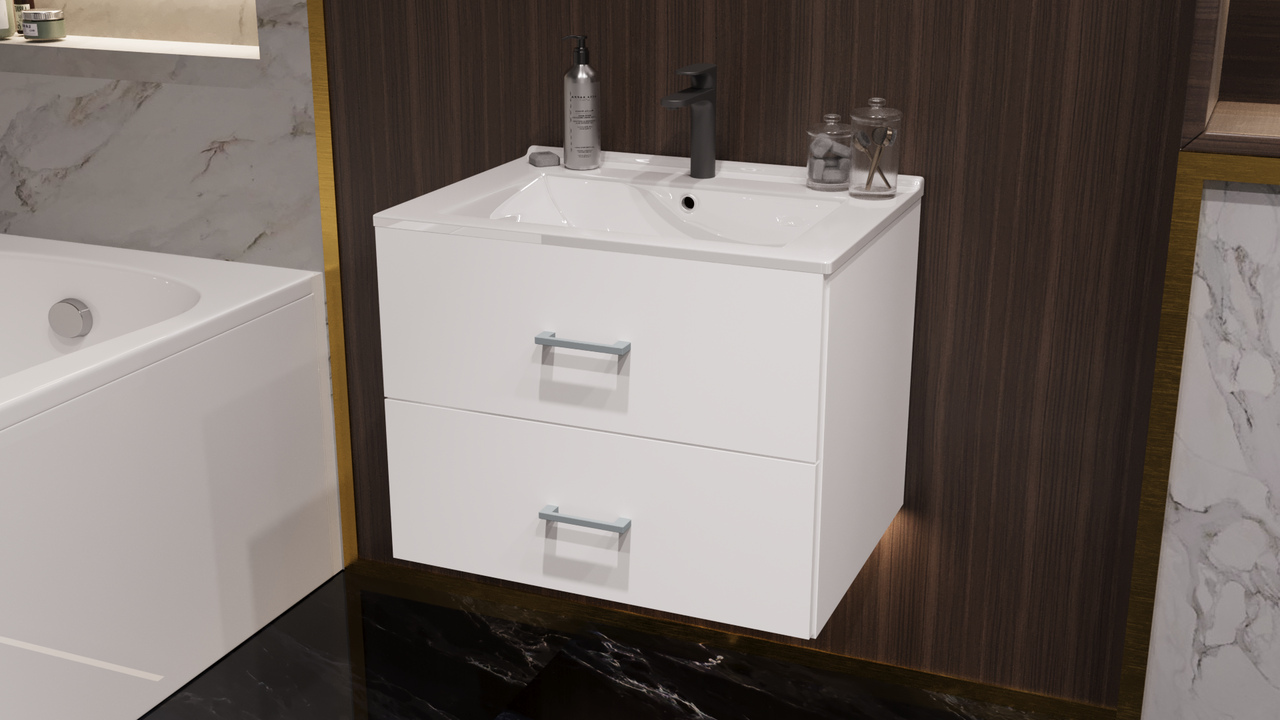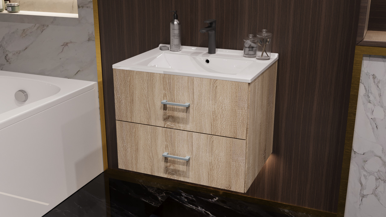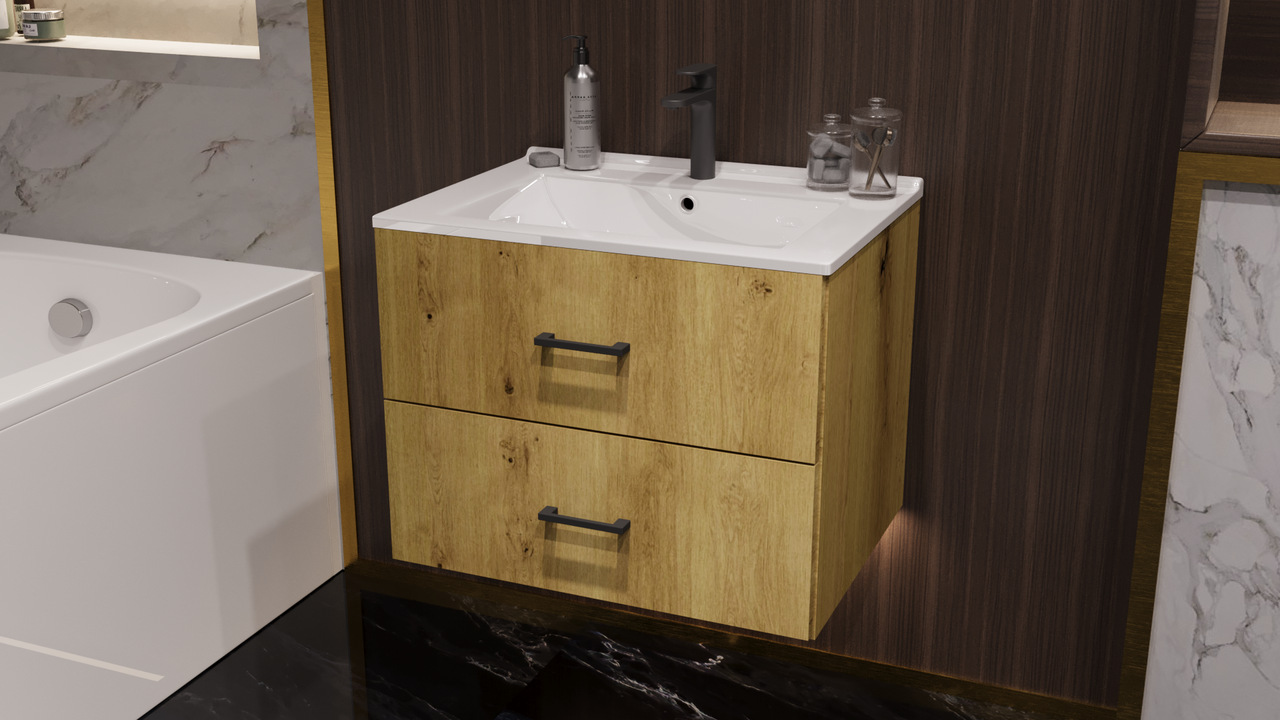 Szafka składa się z dwóch szuflad. Tutaj w sprzedaży razem z umywalką, w pozostałych ofertach można kupić samą szafkę lub samą umywalkę.