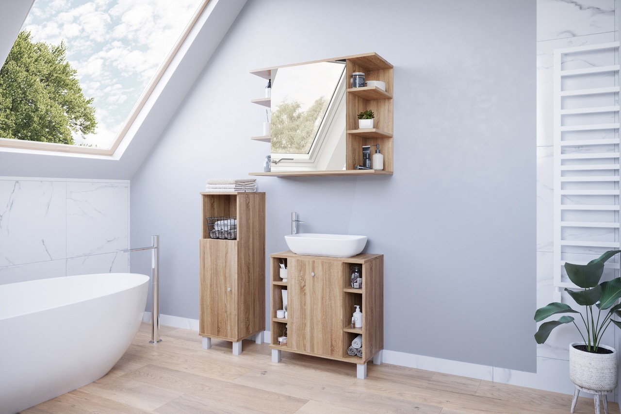 Zestaw mebli wpasowujący się we wnętrze każdej łazienki. Wygodne i praktyczne półki pomieszczą wszystkie niezbędne rzeczy i kosmetyki potrzebne na co dzień. Plastikowe nóżki w szafkach stojących uniemożliwiają przypadkowe zalanie mebli. Ciekawa, a zarazem klasyczna kolorystyka wkomponuje się w styl Twojego mieszkania. Wykonana ze starannością z wysokiej jakości materiałów, co daje możliwość użytkowania przez długie lata.