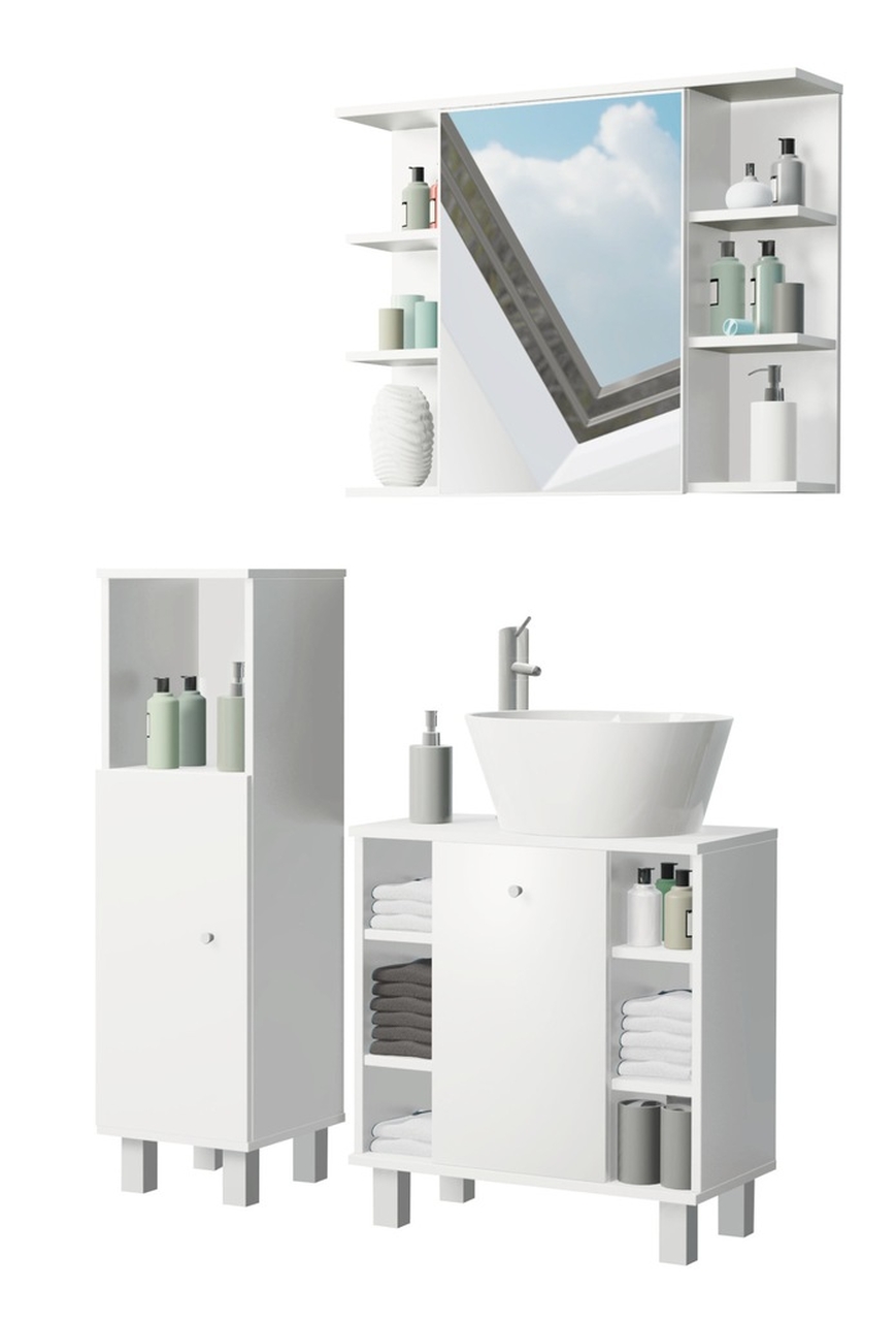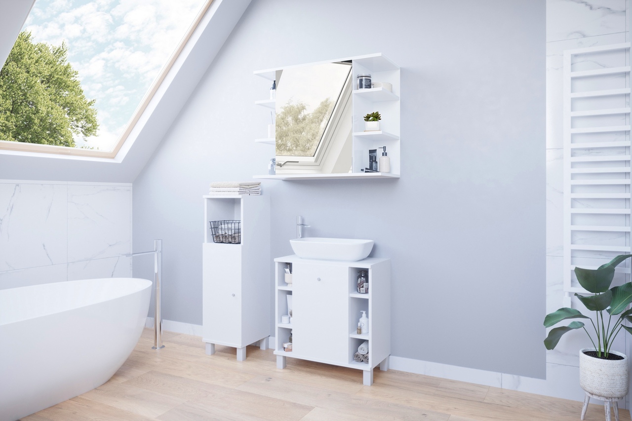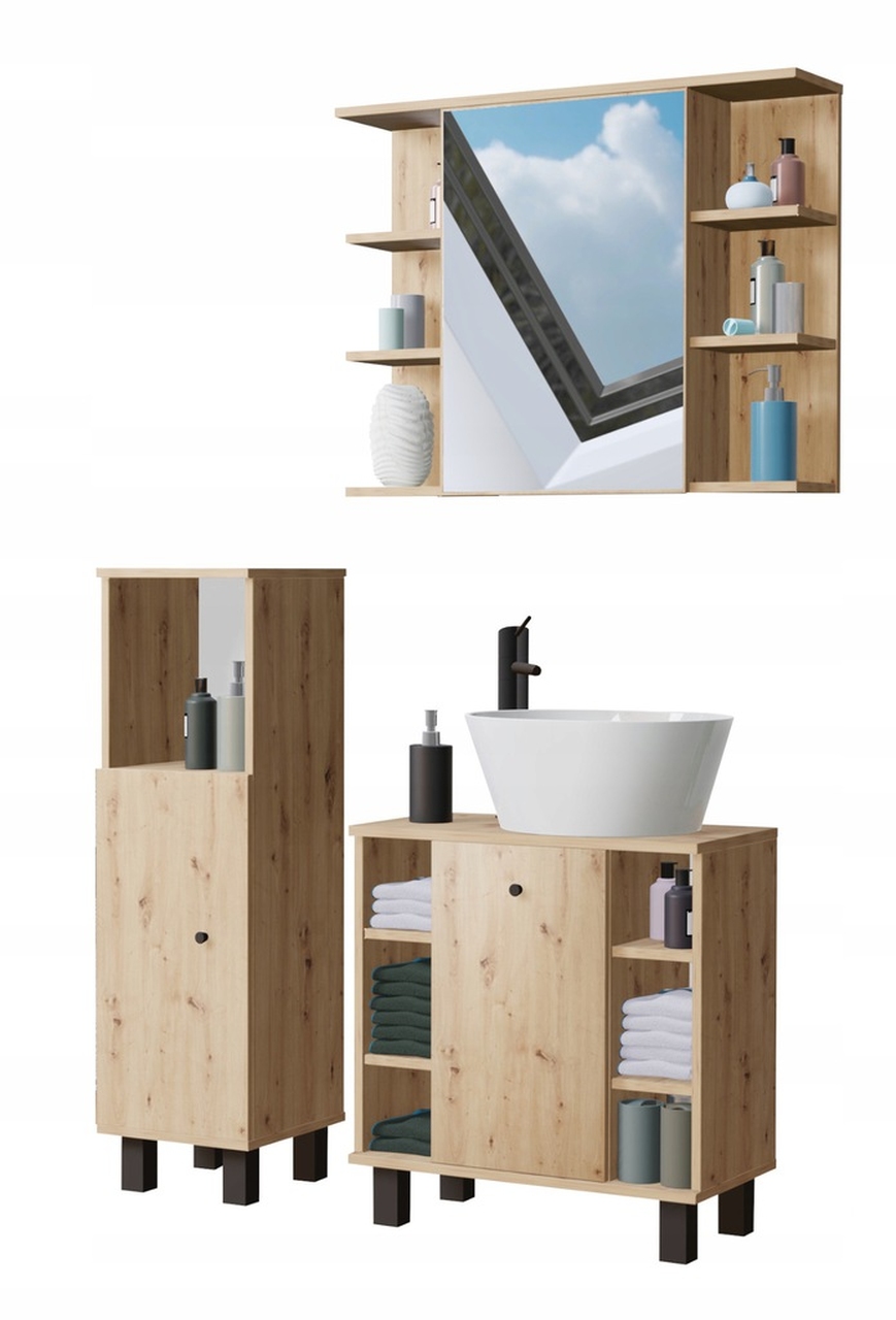Szafka z lustrem posiada łącznie 8 półek, natomiast szafka pod umywalkę jest w jednej bryle z 6 półkami. Niski słupek zawiera dwie półki.